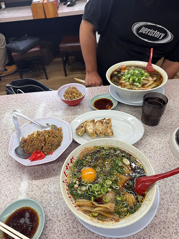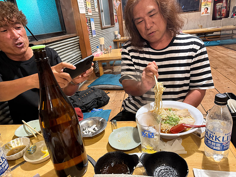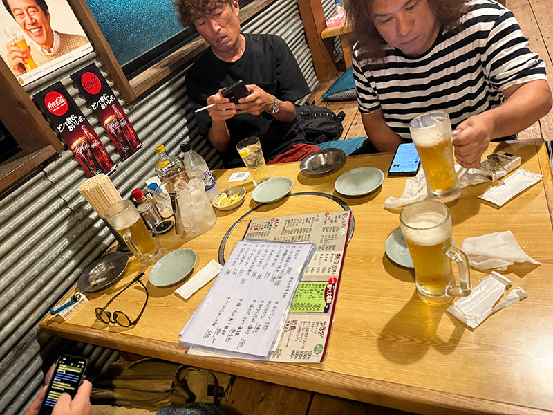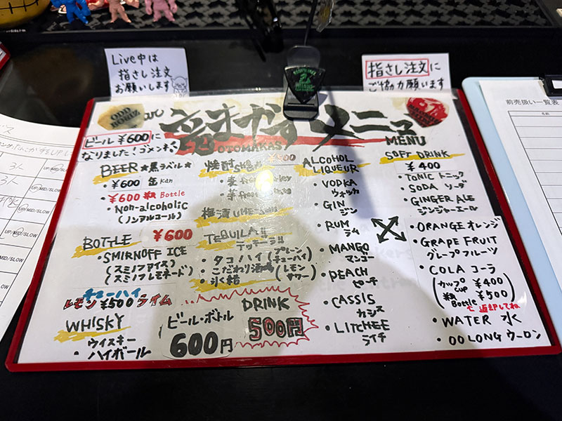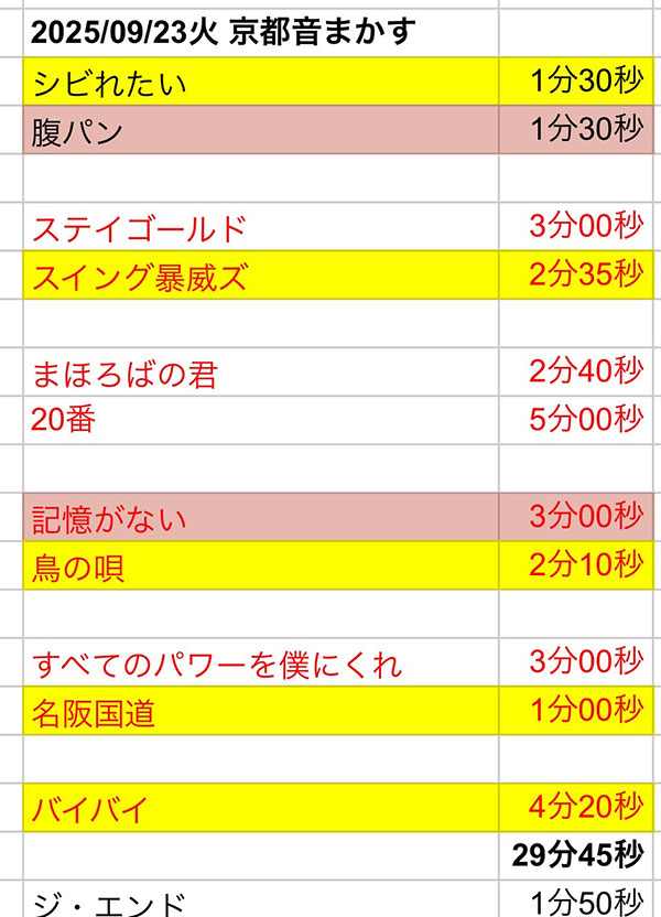 | 2025/09/23火 サソリ急遽Drゴギー京都ツアー 1日目 サソリワン・ボスat 京都音まかす ↓前 次↑ 朝8時にゴギーをジャンボフェリー乗り場でピックUPデス。 ![]() ちなみに昨夜のスタジオはノーペナルティでキャンセルできたんですがホテルが西成のクセに前日で100%、前々日で50%という青天の霹靂。。 ![]() 富田バンドの曲や自身が叩いた6月の音まかすの音源なんかを反復再生しながら京都を目指します。にしてもこの人が今日空いてて助かった。。 ![]() 中華そば専門店 ふくなが、2月に叫ビ隊でも行きましたね。 ![]() 3末に家族で行った時は少し待ったのでドキドキしましたが11時過ぎにしてサクっとテーブル着席。10時開店直後より狙い目なのかも。 ![]() 焼飯はセットの小のみ。 ![]() 餃子は初回ほどの衝撃はないもののやっぱウマし。 ![]() 今回新福らしく生卵トッピングしてみました。 ![]() やっぱウマいですね!必ず大を頼むゴギーが腹パンになるほど多かったみたいで妥当な量でした。ぶれかもしれないけど私のはスープ塩辛目だったので激旨焼飯より白飯がベターかもしれない。ということで街中へ。 ![]() 今回まさかのビジネスホテルが4000ペソで取れてたので一旦機材をソコに預けるという未開の領域な作戦でもって次は心置きなくP探しデスな。 ![]() いつものPはこんなコトに、デスわ。。 ![]() したら川端二条エリアが何台も空いてた!祝日は日曜よりもハードル低いのかな?HOTしつつ音まかすが開くまでの2H弱をツブしましょう、とりあえず近くまで行きましょう。 ![]() ゴギーが「何千万かするんやろうなあ」と言ってましたが確実に桁違うでしょうw ![]() 十字屋でたまちゃんの誕プレ買ったりしつつ新京極を行脚しました。 ![]() 14:30から逆算してホテルまで機材取りに。ちなみに四条河原町下がるで以前家族が泊まったトコかな。川端二条からやと1.7kmとかでした。。 ![]() 更に音まかすの方まで折り返します。ゴギーに高級アイスを振る舞いました! ![]() ギリ雨も降ってなく良かった、音まかす入りです。 ![]() 今日皆残るのなら箱打ちやるかね。 ![]() さて重要なリハです、前回の6月もゴギーでしたが前日練習があった一方今日は完全な一発勝負なんで。 ![]() ちなみにアコAMPはダメダメですねw、ドラム付では使えないコトも学習。 ![]() マツナガさんのNewビンテージ、かっこエエですなあ。ジョガーも案外似合うわSG。 ![]() 定番となりつつある世界の山ちゃん。 ![]() 17時前ならワリと座れます。 ![]() 堀さんに山尾さん、そして先日のTOONICEに続き自衛隊もw ![]() 私とゴギーはまだ腹パンですがw ![]() なみだ巻?がブームになりそう。 ![]() これなら食える?とゴギーがしめ鯖をオーダー。 ![]() リハ最後のエピキュールも激巻きで合流w ![]() 一足先にホテルチェックインしときます。 ![]() 前によく泊まってた西成の小綺麗なトコに似てるな。 ![]() 音まかす、あで750Mあるのでとんぼ返りデス。 ![]() まあ歩くわ。 ![]() マーラータン昼間見た時行列折れ曲がってたで。。 ![]() オンタイム開演したモヨウ。 01-エピキュール ![]() ![]() ![]() ![]() ![]() ![]() ![]() ![]() すっかりお馴染みのメタルバンドですね。Drなかなかキャランおある人に替わったようですが盤石。にしても皆楽しそうに演る! 02-カッコウの卵 ![]() ![]() ![]() ![]() ![]() 何と元ヌボの千田さんと約30年ブリの対バンです。EG及びソングライターというイメージでしたがメインVo初めて見ました、スゴ腕の人らと。。少しでしたが有田さんの話もデキました、ワンチャン今日会えるかもと期待してましたがまたいつか。にしてもこれクラスのアンサンブル久々やなあ。 ![]() 快人は完全追悼モードですな。 ![]() 5日前にオファー受けたゴギーと合わせ結果的に前回の6/22と同じ面子で曲も1つ減らしただけですが確実に違うショーでありマス。 ![]() 演りますか。 03-サソリワン・ボス