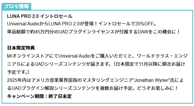 | 2025/11/05水 UADデビュー ↓前 次↑ 温度がサガッテ来ましたね。 ![]() 女王送って朝枝、月見うどん作成でした。さてさて楽天お買い物マラソンで限定P消化しますか。 UNIVERSAL AUDIO/LUNA Pro 2.0 ※単体総額45万円相当のプラグインパック付属 ![]() UADと言えばハードでDSPガンガンやるヤツで導入候補にもアガッテましたが今はWAVESの対抗馬?みたくなってたんですな。で、DAEのセールという体ですが ![]() プラグインが重要というコトです。トミちゃんが教えてくれポチりました。 ![]() WAVESでバグってますが1個数万とかするのもあるらしく試しに鳴らしてみたらかなり良好でした。停滞してるRECの起爆剤ですな、いつもの。嗚呼給付型奨学金ゲット記念日(涙 ↓前 次↑ | |