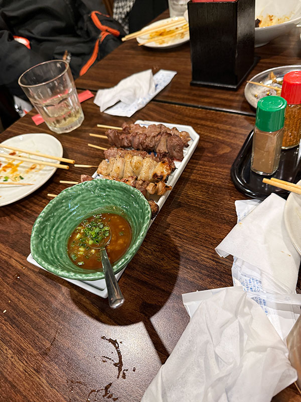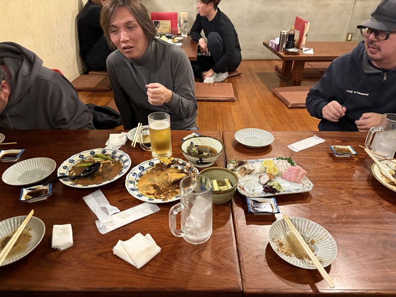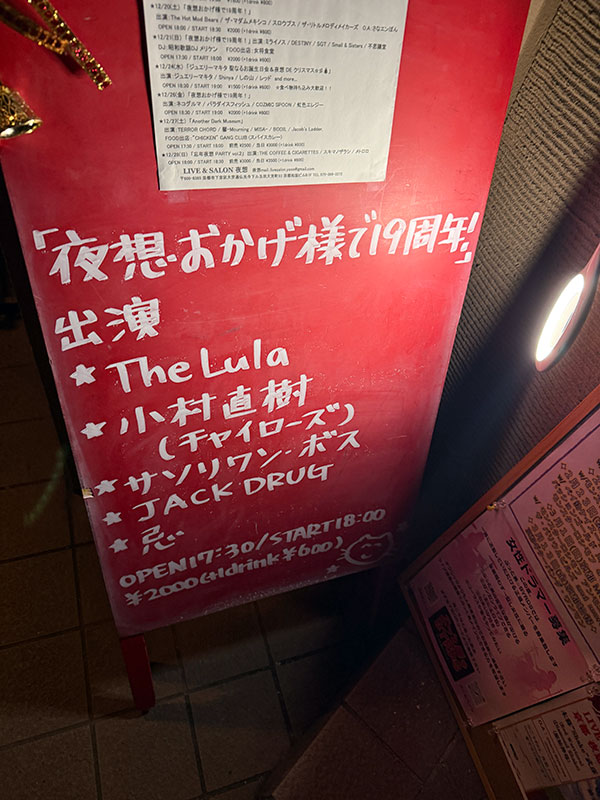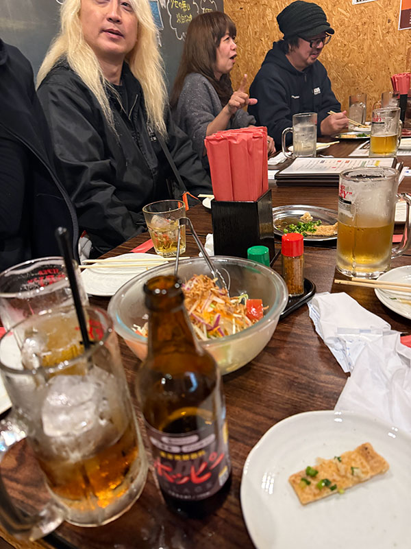 | 2025/12/14日 急遽夜想サソリ京都ツアー 1日目 サソリワン・ボス at 京都夜想 ↓前 次↑ 2025ファイナルツアーですな、朝市イチ出発。 ![]() 8:30にゴギーをピックUPします。 ![]() 室津PAで安定の休憩。 ![]() 山田君とばったりw 以前しんじさんとみっちゃんとばったりなんてのもあったなあ。 ![]() 何と行き先は同じく京都で磔磔にライブ見に行くんだとか。お互い元気なら合流を約束しつつ、それぞれ進みましょう。 ![]() No渋滞されどIC降り間違い結局京都南ICから昼メッシへ。 ![]() 京都なんでラーメンスタートですな。 ![]() とことんとりコトコト、 天一的な鶏こってりの店です。 ![]() めちゃめちゃ丁寧な接客でした。 ![]() 水と温いお茶がサーヴされます。 ![]() ココ最近の京都ツアーで宿題店でもありました。 ![]() 私はハーフの特製を。 ![]() ゴギーはノーマルの鶏の大盛りにライスですか。 ![]() しまったハーフは必ず魚粉入るんやった。。どのみち気持ち悪くなりましたw 餓鬼のようなボール腹のゴギーすら気持ち悪くなったのは大盛り効果? ![]() 食後にアイスティーまで出るのか。ぶっちゃけ伏見桃山のビンテージ店のが食べやすいと思ったがこれはまた来ようとなりますな。 ![]() Pもあるしね。ノーマル特製にライスでリベンジを。 ![]() かなり時間があるのできんこう楽器へ。ここで5年前に買った白SGjr持って来てて弾き比べてみましたが、その時同じく持ち込んだハムバッキングの69スタンダードに圧勝したぐらいなんで65の当たり具合確認にもなりました。67もワビサビで良かったけどね。 ![]() 無事安Pに駐めれました、四条大宮はこういう時ありがたい。 ![]() 夜想は階段案でアンプとか搬入するの大変ですが開くまで待てるのは良いです。 ![]() 14時前にPAの人来て開いたので巻きで搬入。 ![]() おかげでたっぷりリハできました。 ![]() 15時過ぎには前飲みへゴー。 ![]() 前回の叫ビ隊時に感動したハッピアワー居酒屋へ直行。 ![]() 何とが16:30オープンになってた。。 ![]() 庶民に5人はキツいやろうなあ、向かいのここやねんが通しでやってるようなのでここで時間ツブしましょう。 ![]() 鉄板焼かええね。 ![]() ハシゴ前提なんで瓶ビール主体作戦で。 ![]() ジョガー以外好物ですw ![]() お好み焼きではなくもんじゃをオーダー。 ![]() これは良い、盛り上がりましたw ![]() 満を持して大衆酒場かぞくへ。 ![]() 土日でもOKな19時までのハッピアワー条件は刺し身をオーダーすることのようです。楽勝! ![]() 一杯100ペソでっせw ![]() ジョガーの好物もあるからね。 ![]() バターがたまらん。 ![]() 今後Drをどうするか作戦会議。 ![]() これがデキるまで待ってたら開演時間に。 ![]() 取り置きもまだ言ってなかったけどいつもより少なくて助かった!? ![]() 新しい店という認識だったが。。 01-The Lula ![]() ![]() ![]() ![]() 初見でした。ブルース?を基調としたROCKバンドでシルバーウイングスに月イチ出てるんだとか。Bassのお姉さんのキャラがおもろかった。 02-小村直樹 ![]() ![]() ![]() 何度か対バンしたチャイローズの人ですね。相変わらずのPOPセンス。メンバーのまっちゃさん、逆にナッシュに来てるんだよなあ。 03-サソリワン・ボス