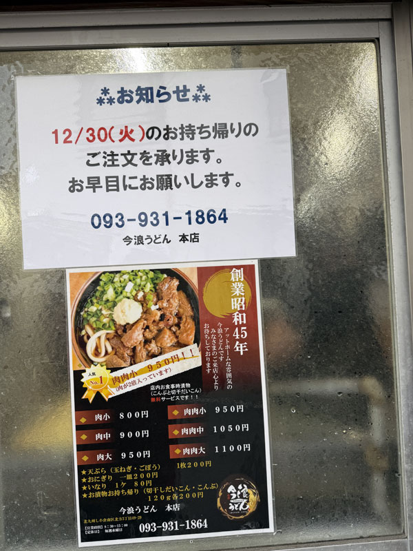 | 2025/12/30火 年末 ↓前 次↑ うわあ2025もあと2日やん、今月とか4回も海渡ったもんなあ。ともかく女王送迎や。 ![]() うどん屋行列各所、年末ですなあ。 ![]() ただこがねは無風でした、10:20ともなれば。 ![]() 年越しそば用の出汁も含め、あと2日に迫ったホットペッパー謎限定500Pを消費しました。 ![]() 新曲完成は来年やな。。 ↓前 次↑ | |