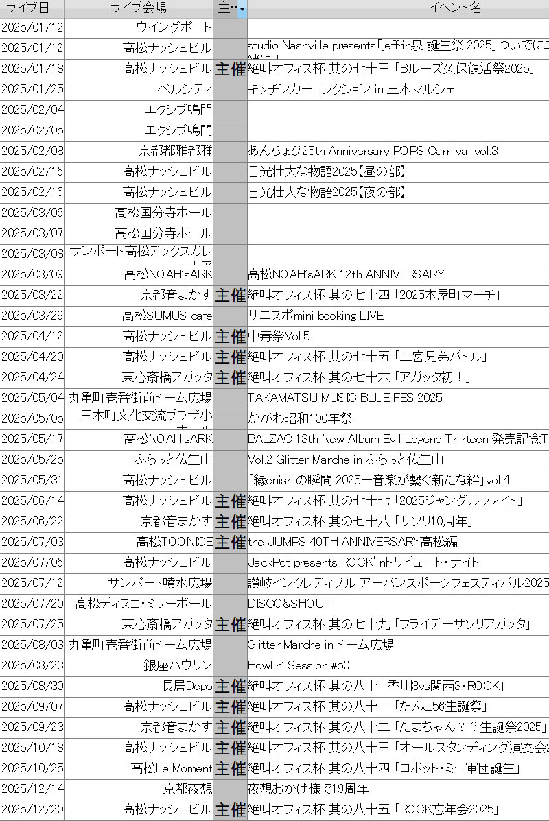 | 2025/12/31水 2025年総括 ↓前 次↑ 前半、初参加した日光壮大やあぷまーしゅのサポート連打もあってライブ数はかなり増えました。 【各バンド】 ![]() サソリワン・ボスはDrがカッキーさんを経て練習を重ねてた初ライブ直前でのマナベ君の急逝。。369月と開催した京都音まかすでの絶叫オフィス杯は2回ゴギー坂本がトラで来てくれました。並行したアコ編成はアガッタでも開始。にしても日光バンドより数が少ないとは。 ものっそ叫ビ隊はBルーズが目の手術後の療養から復帰し年初からマイペースで演れました。長居Depoやミラーボールなんて新しい場所にも立ちましたが、あんちょびが呼んでくれて個人的に超久々京都都雅都雅で演れ激ウケやったことが思い出に残ってマス。 ソロ弾き語りは今年も少なかったですが島さんの店でようやく演れて東京にも行けて良かったです。 トミタバンドなんて新しいのも始めることができました。 ということで合計 ライブ37日49ステージでした。 ![]() 2年連続で生誕祭をデキたコトも良かったです、バンド結構入れ替わってて意義ありました。日光バンドは鳴門での合宿営業が最高やったし、あぷまーしゅのドーム広場もお客さん一杯でおもろかった。ただ感慨深いのは高松サソリでのノアズアークBALZACの時ですかね、マナベ君と最初で最後の対バンでした。 京都5は良いとして大阪3は少ないなあと。あっ、女王が受験モードなんで空気読んででした。。大成功やったルモマンに可能性感じました。 【REC】 思い切って2連続の鬼20曲ReMixである「2025たんこの歴史」を作ったのはマジ英断でした。ただ前年は3アルバム作ったので、他に何かデキなかったのかとは思います。叫ビ隊新作着手はギリしてますが。 【仕事】 前年の好調さを嘲笑うかのよな絶不調でしたが4月から福山に通い出し社運をかけた大逆転を伺う体制に。よく働き酒を飲みました。ツアーぼちぼちでしたがおかげで外泊65日でした。 【作曲】 まったりと(2025/02/28) とうとう年イチで終わってしまった。。ただこれは良い曲デス。 【PV】 情けない2年連続ZEROでした。。ReMixでいくらでもネタがあるのですが。。 【機材】 Fender/Princeton ReverbU 2025/02/07 ![]() Fender/Deluxe ReverbU 2025/03/19 ![]() GIBSON/'65 EB-3 2025/05/10 ![]() Guild/'73 S-100 Standard with Carved Top Natural 2025/06/11 ![]() SHURE/KSM8 Dualdyne (Nickel)2台目 2025/06/24 ![]() Gibson/'78 SG Custom White 2025/08/27 ![]() Gibson/'95 Les Paul Studio 2025/11/03 ![]() Washburn/EA20 2025/11/03 ![]() オクで連続でヤラかした感じありましたが店舗は試奏して買うので間違いないですな、割高でも値打有り。白SGカスタムも味がある感じですがギルドのSGが最高です。 こたんこが高校に進学し軽音楽部入り、一方女王は部活引退で受験モードに。春頃に左膝痛となりマシになったなあと思ったら老眼進行。。お義母さんがお義父さんの後を追うように亡くなり京都の鬼嫁実家はとうとう姉やん1人に。。ずっと気になってた、色んな人を巻き込んだ父実家不動産を全て売却デキきたりもしました。福山のバディから何度も言われましたが娘らに何を残してやれるのかをより考えるようになりました。1年間諸々ありがとうございました。↓前 次↑ | |