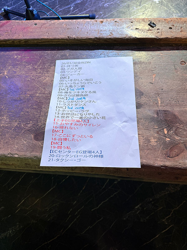 | 2026/01/30金 ものっそ叫ビ隊 at 高松RIZIN ↓前 次↑ 女王最後の登校日です。 ![]() 母校へのおそらく最後の送迎ですな。 ![]() ほんまあっという間やった。。 ![]() 折り返し枝も最後ですな。入試の時に寄って送迎初日から数えて18回ほど行きました。 ![]() あっ、スタンプ貯まったか。 ![]() 日赤のついでにまた来ましょう。ということでライジンワンマンモードですな。 ![]() メンバー及び十河君でガラガラとライオン通りを行きます。 ![]() さあ階段地獄デスw ![]() キャビお店に2つあってズッコケました。。 ![]() リハですな。 ![]() 横幅が案外狭いんやね。 ![]() バー前とかもあるしフロアのキャパはナッシュビルぐらいのようです。 ![]() Youtubeのプレイリスト用意したのを開場後に流してもらいますが、天井から吊るされてるプロジェクターは演者に蹴られて壊れてるそうでw、映像はバーのモニタのみで。 ![]() 店主多田君がワイのHIWATT-67リビエラの音の良さにビビってました。とっておきやもんね。 ![]() 近ちゃんも来てゲスト部分も全てできました。 ![]() こたんこは物販を担当します。 ![]() 楽屋で時を待ちましょう。 ![]() ワンマンやとめちゃ広くもはや寂しいですな。。 ![]() パンチホールも懐かしい。多田君から移転先の内容色々聞いてウナりました。 ![]() 5分押しでスタートしましょう。 ![]() このルート通るの間違いなく最後ですな、そもそも出るの2回目とかですが。。 ![]() さあ演りますか。