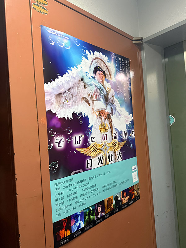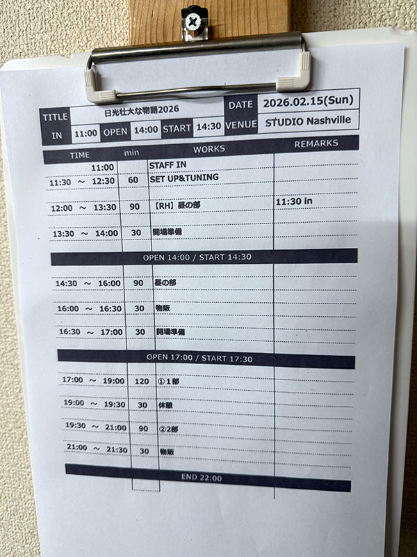 | 2026/02/15日 日光壮大 at 高松ナッシュビル【昼の部】・【夜の部】 ↓前 次↑ 睡眠や準備等まあまあタイトでした。 ![]() 11:20にナッシュへ。1年ブリの大ワンマンであります。 ![]() 昨夜のゲネでミニボードもかなり詰めれました。WIIOがホント効いてる。 ![]() 凄まじいTT、ちなみに夜の部は17:30〜が正解。 ![]() 何と今回弁当が付きます。 ![]() 食べるタイミング今しかない感じなのでリハ前に。ごっつ豪華でウマかった、ナイスミドル1年目を思い出した。 ![]() 何と紺ちゃんが病欠。。代わりに?昨夜は来れなかった羊さんはしっかりいてプラマイZERO!? ![]() この羽根は1曲目限定となったようデス。 ![]() リハ案外早く終わりました。 ![]() 豪華グッズが沢山。 ![]() ドサクサで叫ビ隊のもw ![]() ささ楽屋で少しでも休みますか。 ![]() 今年は参加デキないつくちゃん、お客で来てくれてます。 ![]() 十分チームですよ! ![]() 開演迫ってマス。 ![]() ![]() ![]()