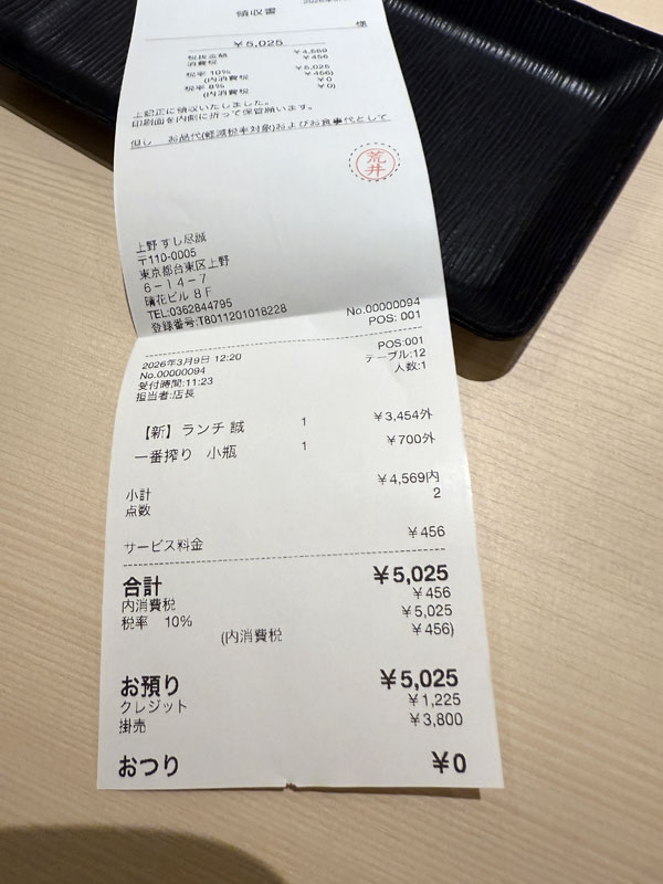 | 2026/03/09月 ワイヤレスイヤホン導入東京出張 3日目 上野綾瀬北千住 ↓前 次↑ ものっそ寝れました。 ![]() 定宿やっぱ良いですな、10時チェックアウトしました。 ![]() アメ横インバウンド少ない? ![]() 昼メッシまで時間ツブすことにしました。 ![]() 午前中から盛況デスw ![]() 長いコト行ってないなあ。 ![]() ここも盛況でした。 ![]() さて行きますか。 ![]() 11:30に予約してる店へずんずんと。 ![]() いつもの食べログ限定Vポイント消費の儀式デス。 ![]() 最上階すし尽誠。 ![]() カウンタを予約してたのですが開店20分ぐらい前で、ひとまず個室で待って下さいと通されました。 ![]() メニューでもチェックしとくか、日本酒高いな。 ![]() ココは瓶ビールやな。 ![]() 11:30で満を持して着席。てかワイヒトリかよw、と思ったら一組のグループが外が見えるさっきの?個室に通されてました。 ![]() そして770ペソでまさかの小瓶w ![]() 板さんは中国人で「キョウオヤスミですか?」から始まりましたw、メジマグロうま。 ![]() タイも良い。 ![]() ヒラメ もそうやけどそれぞれ味付けされてて楽デス。 ![]() 甘エビ塩麹漬けは感動。 ![]() 上野駅前でこの内容で何故こうなのか。 ![]() ホタテ磯部焼きもヤバい。日本酒が安ければなあw ![]() ばらちらし、3杯ぐらい食いたい。 ![]() 蟹味噌茶碗蒸し何たる濃厚さ。 ![]() インバウンド3人組襲来、個室に通そうとしたがカウンタを希望。バイト?のお姉ちゃんが英語で応対しビビる。 ![]() 本マグロ赤身、一番安いコースにしたからこそかもしれんがこれが良い。 ![]() こうイカカラスミパウダー乗せもステキ。 ![]() アジもやっぱウマい。 ![]() アナゴもガスバーナーで直前に炙ってくれ温い。 ![]() トロたく細巻きもはやアート。 ![]() 卵焼きとべったら漬け、嗚呼名残惜しい。 ![]() 赤出しも普通にうまし。 ![]() 町寿司も良いけどここも良いぞ。 ![]() 中国人板さん個室含め大活躍でした。 ![]() わらび餅も実にうまい。 ![]() 3800P使用で1225クレジット払いの贅沢でした。 ![]() また来よう、ポイント貯めて。 ![]() そして今日から北千住のホテルです。一時期よく泊まってましたが高騰→値段こなれてカムバック。 ![]() 着替えやらの荷物もここに送ってました。 ![]() 久々やなあ。 ![]() 千代田線は手前やった。となりの綾瀬でN君と16時に合流。 ![]() 駅前酒場からスタート。 ![]() 海鮮居酒屋やけどボールですわ。 ![]() 本マグロなかおち500ペソ驚愕。 ![]() 本マグロぶつ、筋あるけどこれも500なら十分。 ![]() 菜の花わさび和え良いわあ。 ![]() 虎の子の日本酒は頑固一徹な感じでした。 ![]() サバ500ペソにも驚愕。 ![]() とことん行きたかったがメインの店が控えてるので泣く泣く後に。 ![]() 1H程度でしたがほぼ満席になってました、再訪必至。 ![]() 大松ビンテージ焼きとん。ん?17時開店前やったけど半分ぐらい埋まってる?したら16時からになったようです、張り紙が。 ![]() ここもボールそしてコブクロ刺し。後者は味付け選べて酢味噌に、めずらしいがちと飽きるかな。 ![]() 煮込みは野菜もごろっと。 ![]() ベテラン店員さんが多いです。 ![]() アブラの辛味噌背徳のスルッと入りw ![]() カシラの素焼きおろしがまさかの濃い感じでした。 ![]() 跡取りっぽい人もいたがこういう店はなるべく早く来るべきです、良かった。 ![]() 北千住にモドリッチ。 ![]() 好きやった店の居抜きを確認したりとか。 ![]() N君オススメのざわさんという立ち飲み。 ![]() すげえなクジラとかあるのか。 ![]() それよりもゴンゴンゾーラとーふに衝撃。 ![]() お店で作ってるとか、すげえ! ![]() びっくりするぐらい臭みがなかった。 ![]() めぬけ西京焼きもいかしてました。リピ確定。 ![]() まだまだ未開の地でありマス。 ![]() 天心と同じカットにしてもらおうかな。。 ![]() 嗚呼幸楽、実に10年ブリ。 ![]() これでも値上げしたんかのう。ソフトシェル!? ![]() 勿論デンキブランです。 ![]() 店員はアジア系に総とっかえやけど雰囲気は不変。 ![]() こういうので良いんです。 ![]() エビのソフトシェルは最高やん。 ![]() ちくわ磯辺揚げカレー風味がまさかのポーションw ![]() もっと頻繁に来よう。 ![]() 貪欲に次を物色します。 ![]() ランドマークは一呼吸おいて満席との判決がw ![]() 再度東口へも。 ![]() ここもいつか。 ![]() そうや、ホテルの近くの新しい焼きとん屋もあったな。 ![]() めちゃ歩きましたが終わってました。。N君お疲れ様でした、また次回も攻めましょう! ![]() ホテル帰還。 ![]() 〆はキワモノで。WBC韓国奇跡の突破を見届けて就寝。 ↓前 次↑ | |