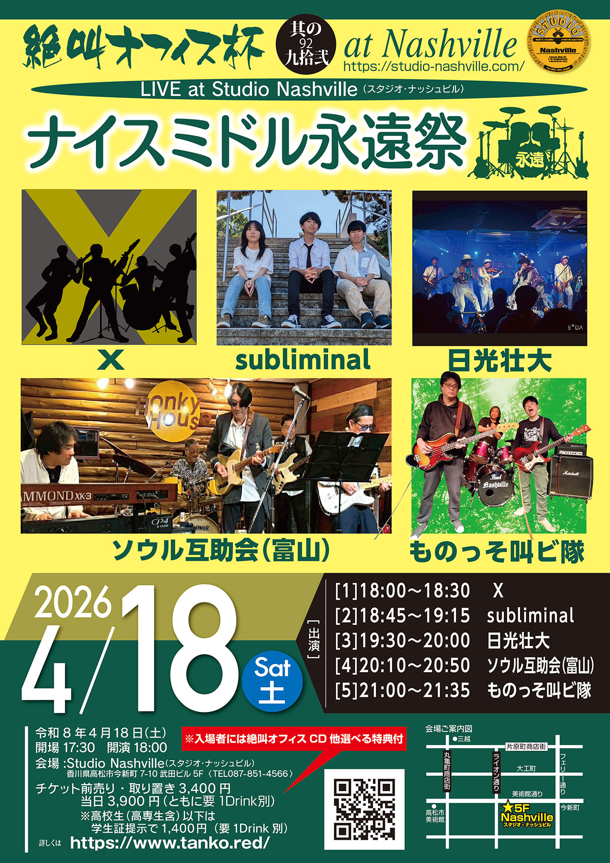 | 2026/04/10金 開運堂野外ライブ動画公開 ↓前 次↑ 先月のサンポート高松デックスガレリア1曲目「心のカギ」のモヨウ。昨年の生誕祭以来半年ブリの始動でしたが、かせやんさんいなくてのアコ3人編成はワイのギターが鬼門ですな。ただ年イチの追悼イベントへ向け良い機会にはなりました。 にしても3/20でしたが肌寒くこの次の日光バンドではハッピ脱いだのでブルブル震えてました。。 【動画はココにも】TOP(ミニ及び各バンド)・PV・叫ビ隊ページ。SOBページ。自作曲一覧。シャウターズはココ。私の歴史動画。 アルバム類。 ↓前 次↑ | ||