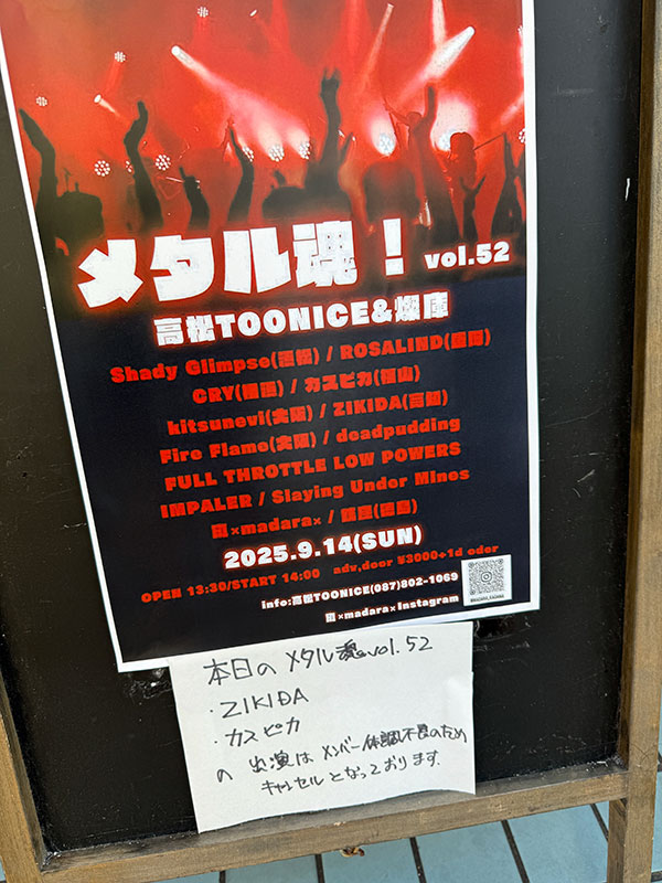 | 2025/09/14日 丸亀送迎〜ライブハウスはしご ↓前 次↑ 朝7時に女王に叩き起こされる。2次会の弊害が。。と思いながら気合で準備。 ![]() 元々模試のハズが申し込みしてなかったというオチで、引退後の野球部の公式戦の応援に行くことに。鬼嫁いないので必然的にワイの送迎となります。 ![]() 坂出でウェイク給油です。デフォでも安いが ![]() 3Dayzクーポンでこんなコトに、嗚呼満タン。 ![]() 丸亀レグザム8:33着。同級生うどん班も駆けつけるので試合だけでも一緒に応援デキるな思ってたが今にも落ちそうなんでハローズPにて爆睡しました。。うわあもう10時やん、試合開始時刻やん。うどん班グループLINEにより 1回に一気に8点取られ ※実は相手が甲子園に出た尽誠学園 コールド負けのおそれが。。着いたら試合終わってそうなんでヤケクソでブランチを物色。 ![]() まごころ、6時から(!)営ってるそうです。駐車場は一杯やったけどかなりの大箱でサクっと入店。 ![]() 見役的なメニューが並びますが普通にかけ小を。 ![]() なかなかおもろいな。ちなみに完全セルフ店ですね。 ![]() レジ横に佃煮もあったしぼっこ屋では無くなった青唐なんかもあって無料トッピングは最強レベル。 ![]() まず冷かけそして熱いのをかけて変化を確認しました、レガシー系出汁やね。にしても量が多いw、そばとのミックスんにするか最後まで迷ったが絶対食えんかったやろな。 ![]() 何故か巨大な鯉を買ってて「エサを絶対にあげないでください」の張り紙があった。。気に入ったのでまた来よう、次回はそばで。 ![]() 2回以降は0に押さえてるモヨウ、とにかく行こう。着いたが駐車場満車になってたので奥の奥まで行ってみる。 ![]() したらボールボーイしてる女王発見w ![]() 旗を下ろす約もするらしく、駐車場で見守り終了後即報告するというタスクを得ました。5回コールドはあと1点のトコで逃れたモヨウ。 ![]() 7点取らんと7回コールド負けか。。 ![]() 最後意地の1点で相当盛り上がったようです。へるちゃん曰く初回以外は点差ほどの差はなくしまった試合だったとのこと。引き続き頑張って欲しい。さて善戦?により午後がタイトになりました。 ![]() 女王の昼メッシをコンビニで買って帰りました。夕刻BBQがあるらしくお迎え来てくれるそうで私も自由になりました。てか1Hだけ落ちました。。 ![]() 鬼嫁もいなくて足が無いのでことでんで行きましょう。 ![]() 目当てのバンドから逆算しての動きでした、TOONICEへ。 ![]() 何と爆音一座山尾さんの息子さんのバンドFireFlameがツアーで! ![]() めちゃめちゃちゃんとしてます。 ![]() あっ、女王合格時ひさ枝にいた人や!w ![]() 塚口でお馴染みの人らも! ![]() TOONICEに溶け込んでました。。 ![]() あっという間に終わった。 ![]() ちなみに今日上の店とのサーキットなんですな、14時スタートてワイが昼寝してた頃や。。 ![]() 燦庫の音、数十M先まで轟いてたようですw ![]() こっちで爆音はちとキビしいかな。 ![]() ある程度で下に退避しダベりました。井川君やアラキさんを山尾さんに紹介デキました。 ![]() 一人北上。 ![]() 今日RIZINでは酒蔵ですな。チケット1500ペソ。。 ![]() お客さんと演者で一杯です。 ![]() ちょうどハバネロが始まるトコロでした。きっつぁんが定位置で仕事してますな。 ![]() そういやTHINKの解散もココやったよなあ。もう11年経つのか、感慨深いやろうなあ。 ![]() しまやんは昨日もライブやったね。 ![]() ワイヤレスマイクのけんさんが客席行脚。 ![]() ワイもワンマンの時には持ってくるべきやね。 ![]() ビーキュー見るのとか何年ブリだろう。 ![]() 久々会ったヒロポンは対バンした叫箱以来言うてたな、て 16年前 ※御厨さんとはたあきら君との懐かしのトリオで出てた かよw ![]() おそらく見るの初めてであろうヤマトマンが食いついてる。 ![]() レアな人変わりませんな。 ![]() ライブハウスより皮膚科に通ってる時の方がバッタリしてたw ![]() にしても相変わらず独特やなあ。 ![]() チェリーもやっぱこのバンドというイメージやね。 ![]() ヒロポンが「今日しー子さん出ないの?」言うてた、いつの話やねん!w ![]() 次はいつ見れるか!? ![]() トリの鬼ごろしで結構帰る。。叫ビ隊もよく経験してるけどね!新Dr入って良かった! ![]() それでも十分いたが。と思いながら私も失礼してアガッタら上に人めちゃいた、皆鬼ごろしも見ろよ!w ![]() 20:30ぐらいでドコも人が溢れて断られるナカ奇跡的にカドゲン押さえました! ![]() TOONICE組と打ち上げデス。 ![]() この店にもおもろいメニューあるな。 ![]() 塚口のお客さん、川鶴好きなんだそうです!今週また裁判が始まるなあ。 ![]() 山尾さんらは昼過ぎに一鶴決めたそうです。 ![]() 自衛隊の人はジャンボフェリーで来たそうですがソコのうどんがベスト言うてましたw ![]() TOONICEやノアズアークの時はここやな。 ![]() イベント終了後にFireFlameのメンバーも合流しました。 ![]() 長い一日だった、また関西で! ![]() トリキにならず開運堂坂本君を発見!w 元気そうで良かった。 ![]