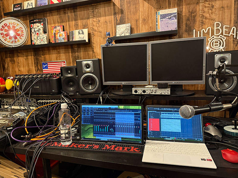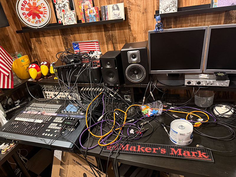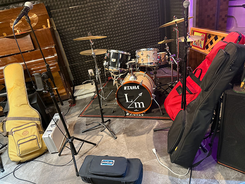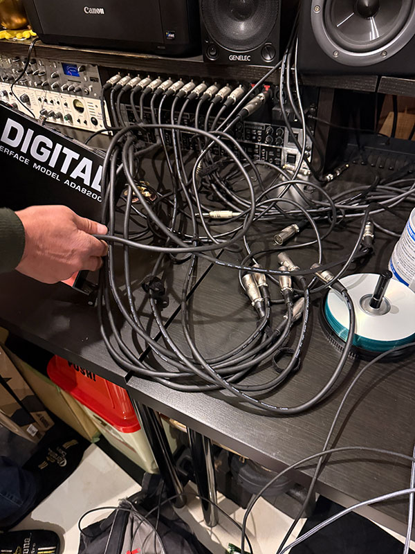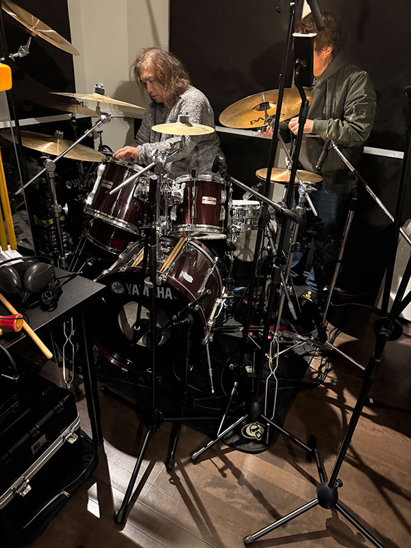 | 2026/01/14水 ものっそ叫ビ隊DrREC at 定やんスタジオ1日目 ↓前 次↑ いよいよ叫ビ隊4thアルバムのDrRECの日でありマスリーナ。 ![]() サムライズ2nd以来20ヶ月ブリですね、考えられる限り色んな物持って行きましょう。 ![]() 今回は定やんスタジオで録らせてもらいます、10時前に到着。ロボット・ミー軍団のも勿論想定しとりマス。 ![]() 昨夜預かったゴギーの剥き出しスネアごと搬入。 ![]() 何とオペレータはコントロールルームに居て良いんですな、自分でエンジニアやるようになって初ですわ感動。 ![]() ブースとかなりの数のケーブルが繋がってますね。 ![]() トミちゃんも来てくれててマイキングお任せしました。 ![]() 元々SHUREのKICKあるんですがトミちゃんが持ってきてくれたクジラ(!)も併用することに。 ![]() メインのオーバートップはコンデンサが常に設置されてますね。 ![]() スネアは57で裏からも録るとのこと、初めてデス。 ![]() ハイハットも57ですね。 ![]() タム3つはAKGですか。 ![]() 常に装着されてますね。 ![]() フロアは550とやら。 ![]() カウベルはコンとどれも拾いますが一発の場合タムが共振するので別録りかギミックで。 ![]() そしてゴギー発言用にこれも。 【RME Babyface Pro FS直】 1ch-RODE NT1A ハイハット 2ch-SENNHEISER MD421 バスドラ 【ADA8200】 1ch- オーバーTopL 2ch- オーバーTopR 3ch-SHURE バスドラ 4ch-SHURE SM57 スネア 5ch-SHURE SM57 スネア裏 6ch-AKG D440 ハイタム 7ch-AKG D440 ロータム 8ch-AKG D550 フロアタム 今まではアンビエンスにメイン急のコンデンサをステレオで配置してたけどそれの代わりにバスドラとスネアを増やしたカタチ。まあドラムセット自体囲ってるし、そもそもMIXの時にトゥーマッチのよな感じもしたのであと2口あるけどこれでやってみましょう。 ![]() なんか新鮮な景色やわ。 ![]() ADAT8ch勿論活躍デス。 ![]() てかワイはヘッドフォンする必要ないの革命的やめちゃ楽!セッティングからの「アパート」1曲撮ったHぐらい。 ![]() 遅めの昼メッシは水曜3割引のおくどさんへ。 ![]() 複数で来るのが醍醐味ですな。 ![]() パワー出た! ![]() さあ本格的にやりましょう。 ![]() 方々お疲れですぞ。 ![]() ちなみにゴギーのMCマイクをRCブースカ経由で無らしましたがワイのはRME通らずブース内のスピーカーからでした。口一つ余ってるのでブースターもう一発でもって仕込むべきでしたね。 ![]() 「おやすみのサイレン」「スタンディング・ツアー」「闘う私」「メガ人間」「ガマンする」と都合6曲録れました。最近やってる曲はサクっとイケますな。 ![]() ゴギーのリミット19時の1H前で今日はココまでとなりました。RMEとノートは持って帰りますが大半置いて行くので第二弾はサクっとイケるでしょう。 ![]() にしてもスタジオ持ってるの羨まし杉。めちゃちゃんとした音録れましたよ。 ![]() 明日出張でタイトやけどデカいモニタで少しでも整理しておきましょう。 ↓前 次↑ | ||